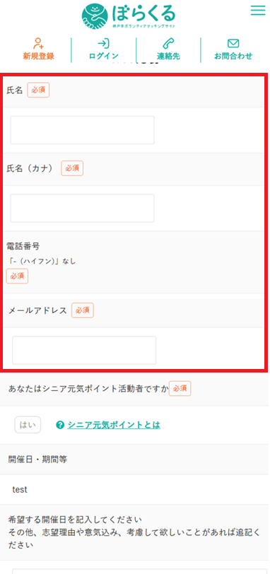 個人情報を入力することなく簡単に応募をする方法 会員登録せずに、ゲストで参加応募する際には氏名、電話番号、メールアドレス等の個人情報の入力を毎回行う必要があります。会員登録をしていただくことによって、個人情報の入力が必要なくなり簡単に応募ができます 1.ゲストの場合には下記画面のように氏名、電話番号、メールアドレスの入力が必要です 2.会員登録している場合の参加申し込み画面では氏名、電話番号、メールアドレスの入力が不要となり簡単に応募ができます