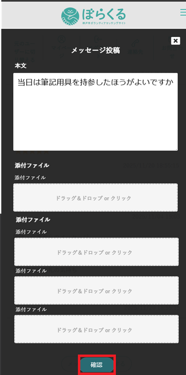 4.メッセージを記入し【確認】を実行します