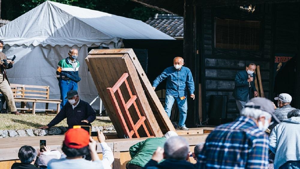 会場となる下谷上農村歌舞伎舞台(下谷上の舞台)は国指定重要有形民俗文化財に指定されており、今年、20年ぶりに茅葺き屋根の葺き替え修理が行われ、今回の上演会が葺き替え修理完了後、初めての上演会になります。また、上演会開催前には「茅葺き屋根葺き替え修理完成記念式典」も開催します。