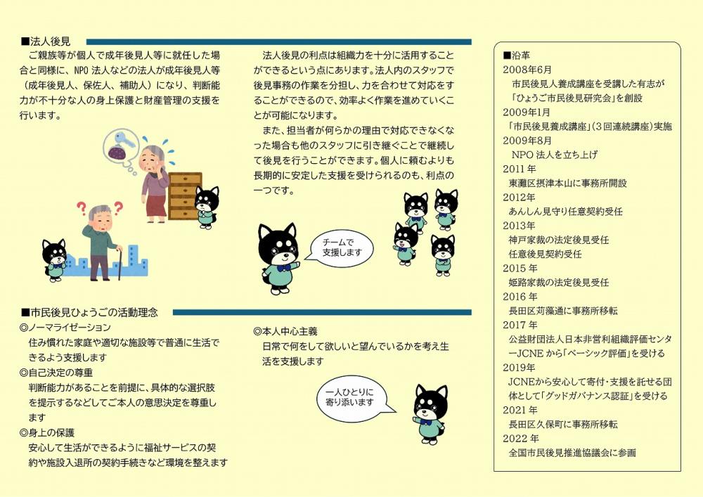 成年後見人とは、高齢者などの判断能力が衰えた方の、財産を守り、身辺の支援をする人のことです。お年寄りを支え、より添い、思いやる、社会にとってとても大切な活動です。私たちと一緒に新たな役割と出番を見つけませんか。活動内容は、①病院や介護サービスの契約、②収入と預金通帳の管理、③各種支払いや行政手続きの代行、④月1回の訪問しての見守り、など。(身体の介助など、お年寄りに触れるような活動はありません)。スタッフ全員で分担し、力を合わせて、みんなで進めます。経験や資格は不問。はじめての方でも丁寧に説明しますので、安心してご応募ください。