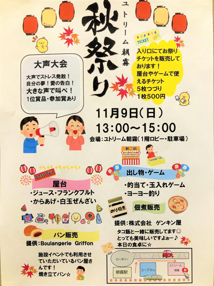 介護付き有料老人ホームのユトリーム朝霧では11月9日(日)10:00~15:00に施設内で秋祭りの開催を予定しております。10:00~12:00は入居者様向け、13:00~15:00は地域の方々向けに開催を予定しております。その際のブース運営にご協力頂ける方を募集しております。