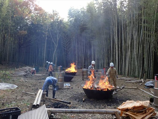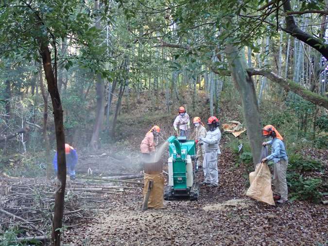 須磨区多井畑の里山での放置竹林の整備活動(竹の伐採、チップ化、竹炭化など)