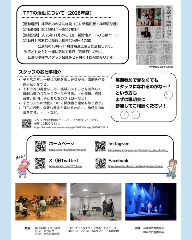 Teenagers' Free! Theater(TFT)は、2005年に兵庫教育大学の課外プロジェクトの一環として始まった、ちょっと学校に行きにくい10代のための演劇サークルです。